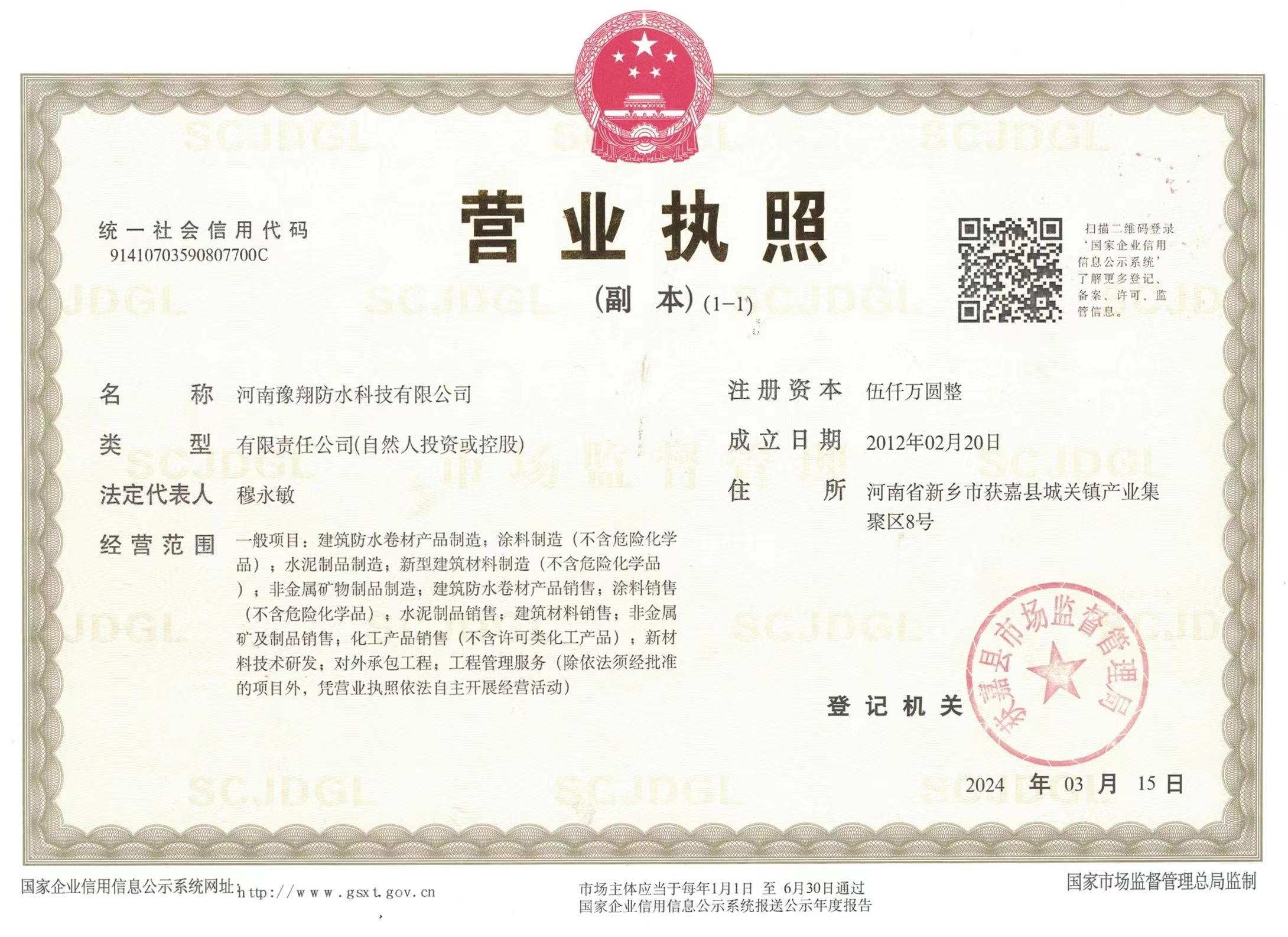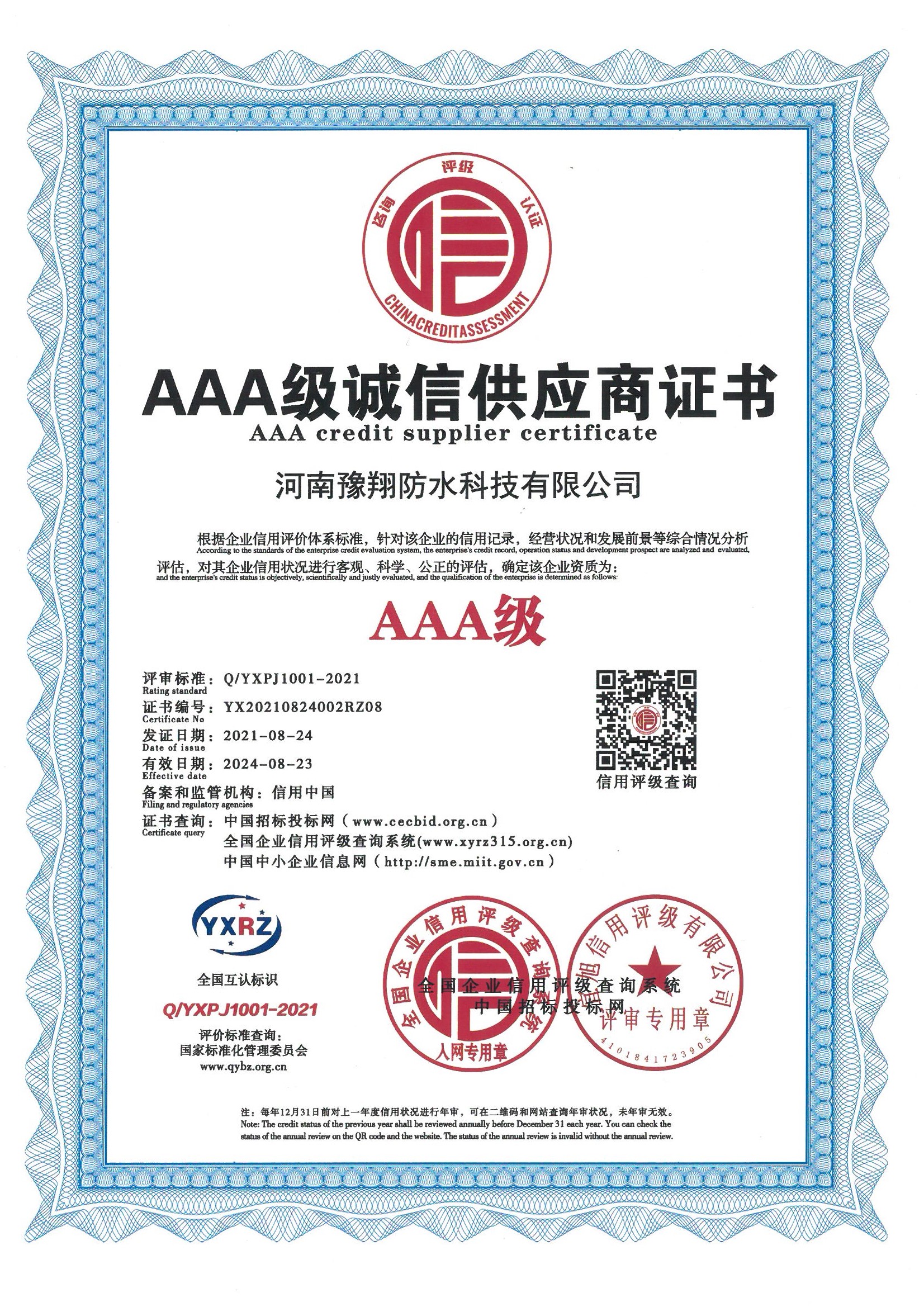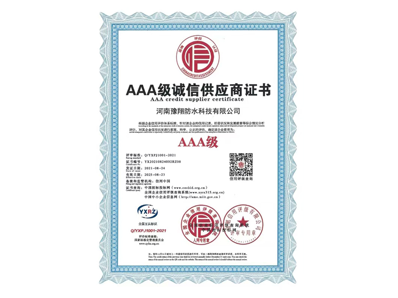 公司是中國(guó)建筑防水協(xié)會(huì)會(huì)員單位、河南省建筑防水協(xié)會(huì)會(huì)員單位、中國(guó)中鐵建筑CRCC認(rèn)證合作單位、中國(guó)中輕產(chǎn)品質(zhì)量保障CQGC認(rèn)證單位、國(guó)家康居示范工程產(chǎn)品單位、中國(guó)綠色環(huán)保家裝產(chǎn)品推廣單位、全國(guó)道橋高分子防水涂料國(guó)家標(biāo)準(zhǔn)參編單位,連續(xù)多年被評(píng)為“中國(guó)3.15誠(chéng)信企業(yè)”、河南省“守合同重信用企業(yè)”。